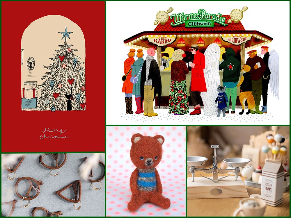 ※(上段左)くらはしれい複製原画作品「素敵な夜を」、(上段右)小林マキ原画作品「To gather」、(下段左)kitona木製装身具「動物のキーホルダーシリーズ」、(下段中央)楠のぶおニードルフェルト作品「ボーダーくまちゃん」、(下段右)COCOROWOOD木製おもちゃ