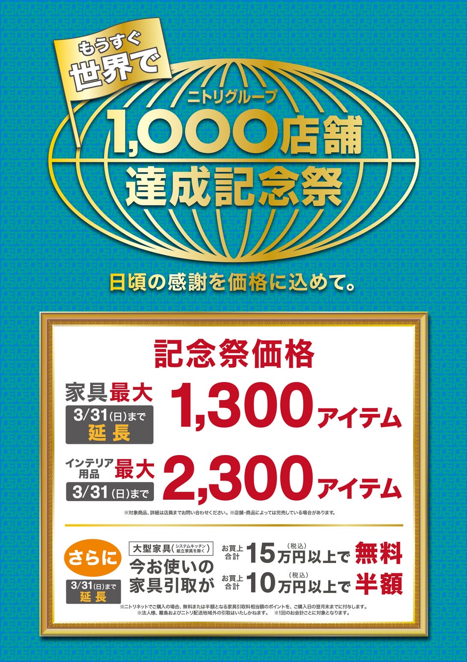 「もうすぐ世界で、ニトリグループ1,000店舗達成記念祭」を3月31日(日)まで開催しております