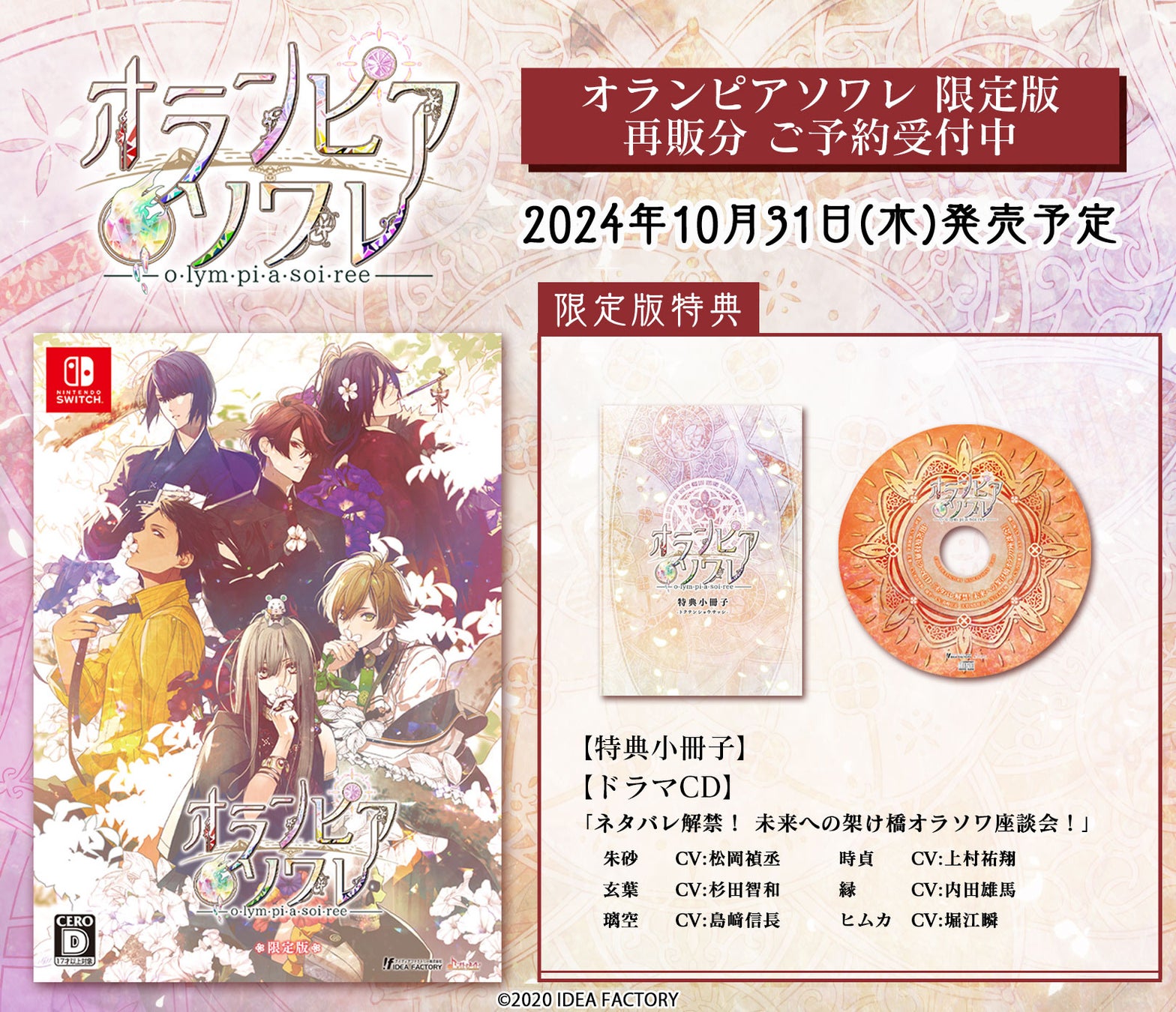 続編の制作を記念し、ただいまアイディアファクトリーでは、2020年に発売された「オランピアソワレ」限定版を再販分として予約受付中です。一部販売店様の店舗特典も併せて復刻しておりますので、この機会をぜひお見逃しなく!