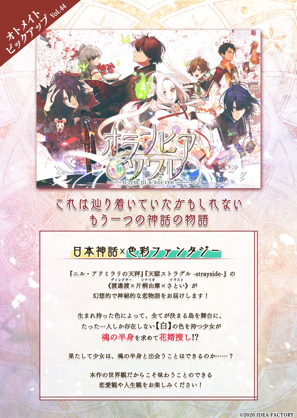 アイディアファクトリー株式会社(代表取締役社長:佐藤 嘉晃/所在地:東京都豊島区)の女性向けゲームブランド「オトメイト」は、続編の制作が決定し、現在初作の限定版の再販を実施しているNintendo Switch™用ゲームソフト「オランピアソワレ」の特集記事「オトメイトピックアップ Vol.44」を公開いたしました。