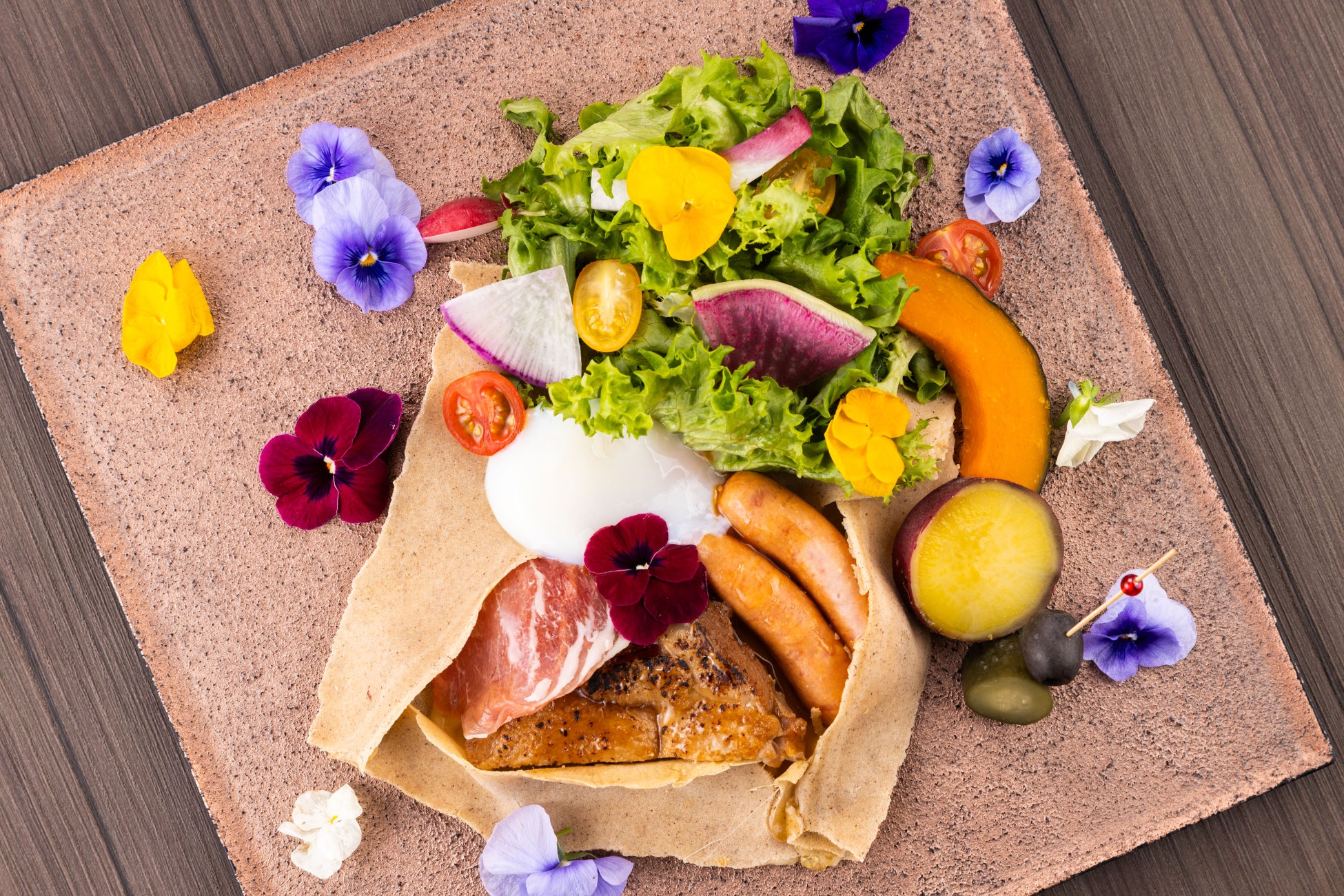 雪化粧した安曇野の風景をイメージした前菜には、FARM SANKICH!の新鮮な葉物野菜を使用し、彩りを添えてくれます。冬でもみずみずしい香りと食感をお楽しみいただけます。