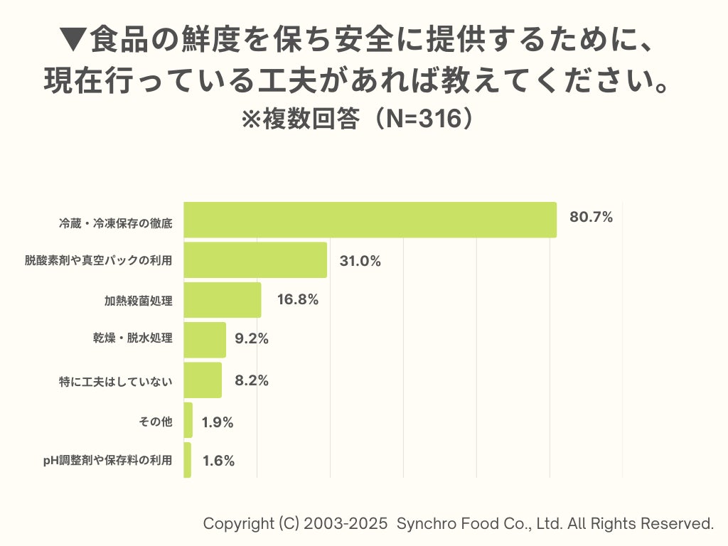 その上で、食品の鮮度を保ち安全に提供するための工夫について複数回答可で尋ねたところ、「冷蔵・冷凍保存の徹底(80.7%)」が最も多く、「加熱殺菌処理(16.8%)」「乾燥・脱水処理(9.2%)」と続く結果となりました。
