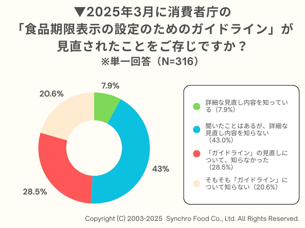 こうした背景がある中で、2025年3月に消費者庁が見直しを発表した「食品期限表示の設定のためのガイドライン」について認識があるかを尋ねました。結果は「聞いたことはあるが、詳細な見直しについて知らない」が43.0%で最多に。次に「見直しについて、知らなかった(28.5%)」「そもそもガイドラインについて知らない(20.6%)」が続き、「詳細な見直し内容を知っている」との回答は7.9%に留まるかたちになりました。