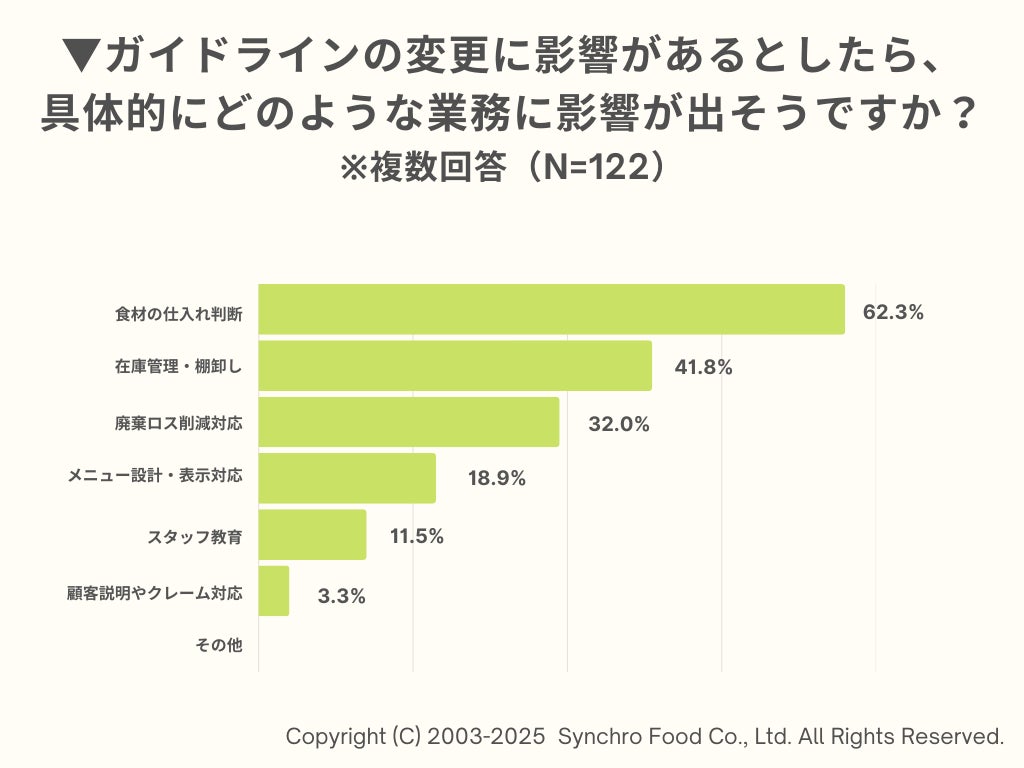 また「大きく影響する」「やや影響する」と回答した飲食店に、具体的にどのような業務に影響が出そうか尋ねたところ、「食材の仕入れ判断」が62.3%と最も多く、次いで「在庫管理・棚卸し(41.8%)」「廃棄ロス削減対応(32.0%)」「メニュー設計・表示対応(18.9%)」と続きました。