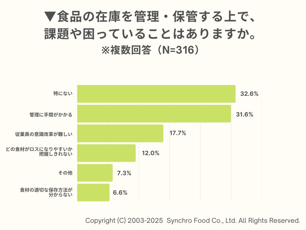 食品の在庫を管理する上での課題について聞くと、「特にない」と答えた飲食店が32.6%で最多に。次いで「管理に手間がかかる」が31.6%で多く、「従業員の意識改革が難しい(17.7%)」「どの食材がロスになりやすいか把握しきれない(12.0%)」と続くかたちになりました。