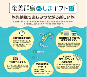 「旅先納税®」および「奄美群島eしまギフト」は、株式会社ギフティが提供する「e街プラットフォーム®」を採用し運用します。旅行者等が旅行前・旅行中にふるさと納税を行うと、返礼品として電子商品券(名称:奄美群島eしまギフト)がお手持ちのスマートフォンに即時発行され、エリア内の加盟店で利用できるサービスです。ジャルパックは、本サービスにおいて加盟店募集および管理業務、精算業務、プロモーション等を行います。