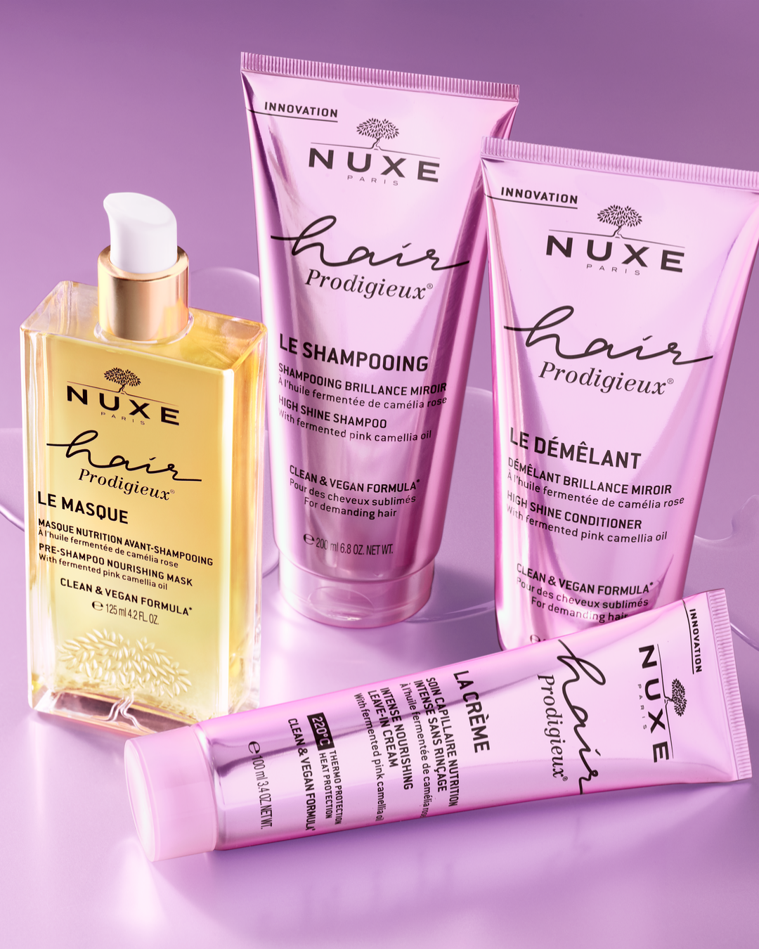 輝きの効果をもたらすものが、画期的な新成分、発酵ピンクカメリアオイル(1) です。ニュクス研究所が発表した画期的な新コレクション「ヘア プロディジュー」は髪本来の美しさを引き出す、ニュクス初のヘアケアラインです。あらゆる髪質の方にお使いいただけ、4ステップのルーティンによって、さらりとした手触りを損なうことなく、プレシャンプーというファーストステップを加えることで、サロンでお手入れしたかのような美しいツヤと優れた補修効果を実現します。上質な植物オイルを贅沢に配合し、ブランドを代表するプロディジュー オイルにインスパイアされた革新的なコレクション。ニュクスは植物オイルに関する30年のノウハウを生かし、画期的な処方を採用。独自の発酵プロセスで抽出した発酵ピンクカメリアオイル(1)で、補修力を強化しています。ヴィーガン処方(2)&シリコンフリーの4製品は、ニュクス研究所のクリーンビューティ規定(3)に基づく処方で、髪をいたわりながら、まるで鏡のような光沢を生み出します。