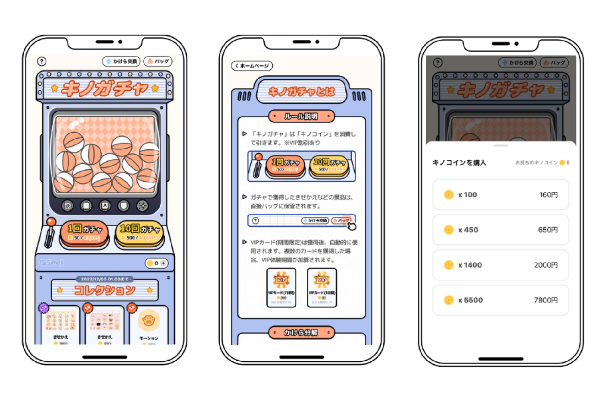 キノコインを消費してキノガチャを引くことで、きせかえやデコパーツなどの景品を入手することができます。
