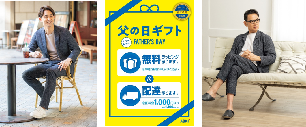 AOKIでは、新生活様式の定着に伴い2020年11月にパジャマのような「リラックス感」とスーツのような「きちんと感」を兼ね備えた『パジャマスーツ®』を発売。当初はリモートワークウェアとしてご利用いただいておりましたが、2022年春夏では、ノーカラージャケットの他にも、テーラードジャケットやジレスタイルなどラインナップを大幅に増やして展開しており、自宅でのリラックスウェアはもちろん、ちょっとしたお出かけ着、ビジネスウェアなど幅広いシーンで着用いただいております。多くのお客様にご好評いただき、『パジャマスーツ®』はこの度シリーズ累計販売着数15万着を突破いたしました。ビジネスからカジュアルまで幅広いシーンで着用でき、1着でコーディネートをかっこよく決められる本商品を、AOKIではお父さんに日ごろの感謝を伝える「父の日」のおすすめアイテムとしてご提案いたします。さらに、特設サイト「パジャマスーツ®初めてガイド」では、ギフトにどのような『パジャマスーツ®』が良いか迷っている方に向け、スタイル・デザイン・着用シーンごとに、アイテムを選ぶお手伝いも行っており、お父さんにピッタリな1着を見つけられます。全国のAOKI店舗およびAOKI公式オンラインショップでは、ギフト用ラッピングを無料で行っており、日ごろの感謝を伝えるお手伝いをさせていただきます。