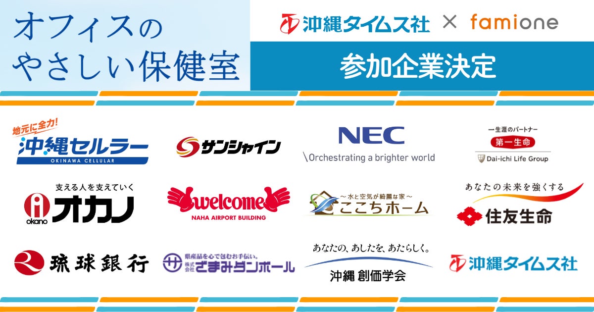 「子どもを願うすべての人によりそい 幸せな人生を歩める社会をつくる」をビジョンに掲げ、法人の従業員向け福利厚生や自治体の住民向け支援を行うヘルスケアサポートサービス「ファミワン」 https://famione.com/benefit/などを展開する株式会社ファミワン(本社:東京都渋谷区、代表取締役:石川勇介)が、株式会社沖縄タイムス社(本社:沖縄県那覇市、代表取締役社長:瑞慶山秀彦)と連携して運営している、企業向け健康経営サポートサービス「オフィスのやさしい保健室」の参加企業が決定いたしました。