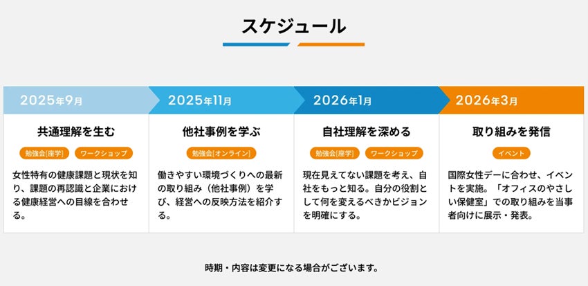 参加企業の皆さまには、ヘルスケアやマネジメント、女性特有の健康課題に関するリテラシー向上のためのe-ラーニングのご提供に加え、9月・11月・1月に開催する勉強会を開催します。また、沖縄タイムス社による紙面及びWebを通じた企業の取り組みの発信・PR、さらに3月に予定しているイベントでの情報発信も予定しています。
