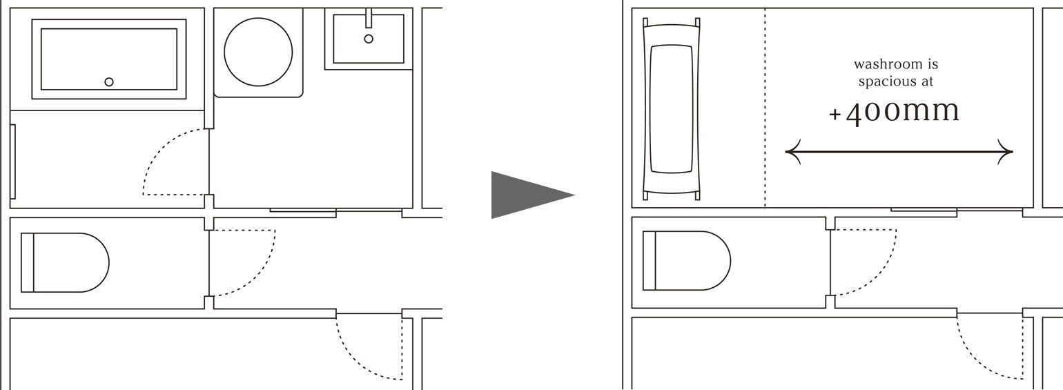 1616サイズ(1600mm x 1600mmの規定サイズ)のユニットバス(左図)をbathtope に交換することで、洗面室側を400mmも広げることができます(右図)。さらにGタイプでは、壁一面がガラスになるスリムテンパー引違い戸の開口により、前室空間とのつながりも強調できます。