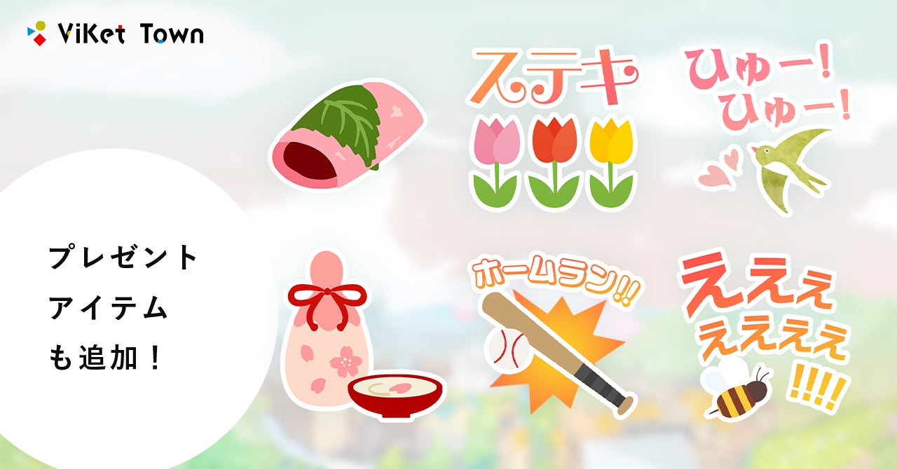 ViKet Townではプレゼントやメッセージ付きアイテムも毎月更新中。コミュニケーションを促すスタンプや、気分を盛り上げるアイテムのほかお花見フードや、これから活発になる生き物たちなど季節をたっぷり楽しめるアイテムが登場!