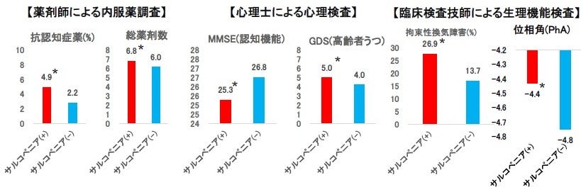 ・心理検査では、サルコペニア患者は認知機能(MMSE)が低く、うつのスコアが高値であった。