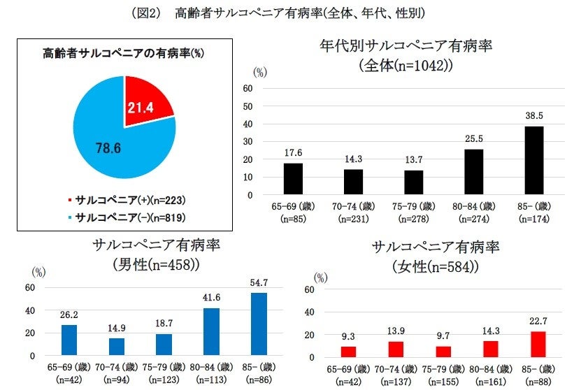 全体(n=1042)におけるサルコペニア有病率は、 21.4% (223例/1042例) であり、年齢が上昇するにつれて、特に80代以降で増加し、女性と比べて男性では80代以降で有病率が急増することが明らかとなった。本邦におけるサルコペニアの疫学では、一般の地域住民を対象とした過去の研究では、約14%前後(7~22%)と報告されている(*2)が、本検討では一般地域住民の有病率より高かった。