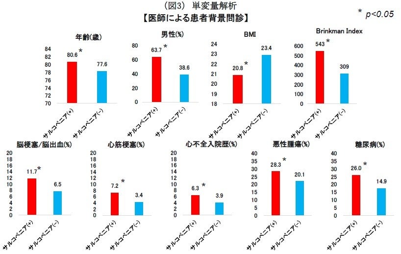 ・サルコペニア患者は非サルコペニア患者に比べて、高齢で、男性に多く、BMIは低値であった。また、併存疾患としては、脳梗塞/脳出血・心筋梗塞・心不全入院歴(+)・悪性腫瘍・糖尿病を有する症例に多く認めた。