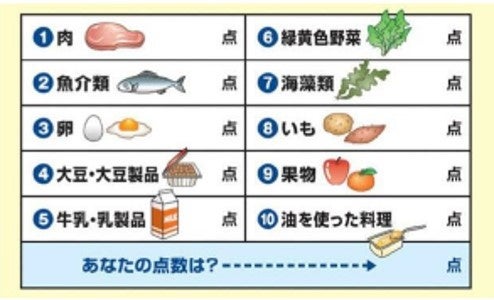 主食や嗜好品を除き、日本人が普段食べる主菜・副菜・汁物の約80%を占める食品群として、肉類、魚介類、卵類、牛乳、大豆製品、緑黄色野菜類、海藻類、果物、いも類、および油脂類の10食品群の1週間の食品摂取頻度から評価する。各食品群に対して、「ほぼ毎日食べる」に1点、「2日に1回食べる」、「週に1、2回食べる」、「ほとんど食べない」の摂取頻度は0点とし、その合計点をDVSとするもの。