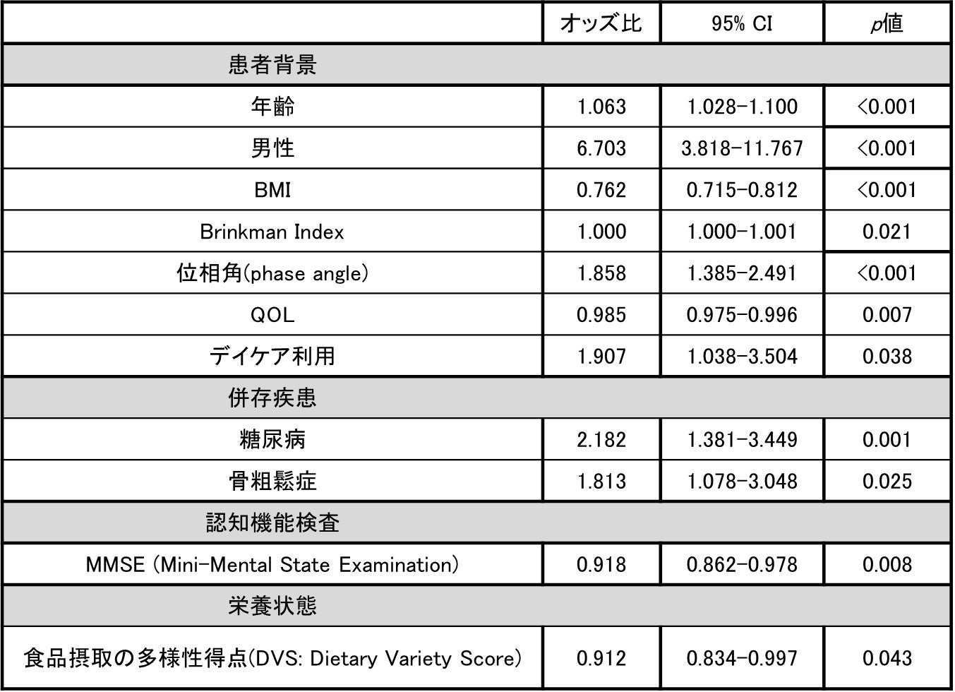 ・多重ロジスティック解析では、高齢者サルコペニア患者では食品摂取の多様性が低下していた。
