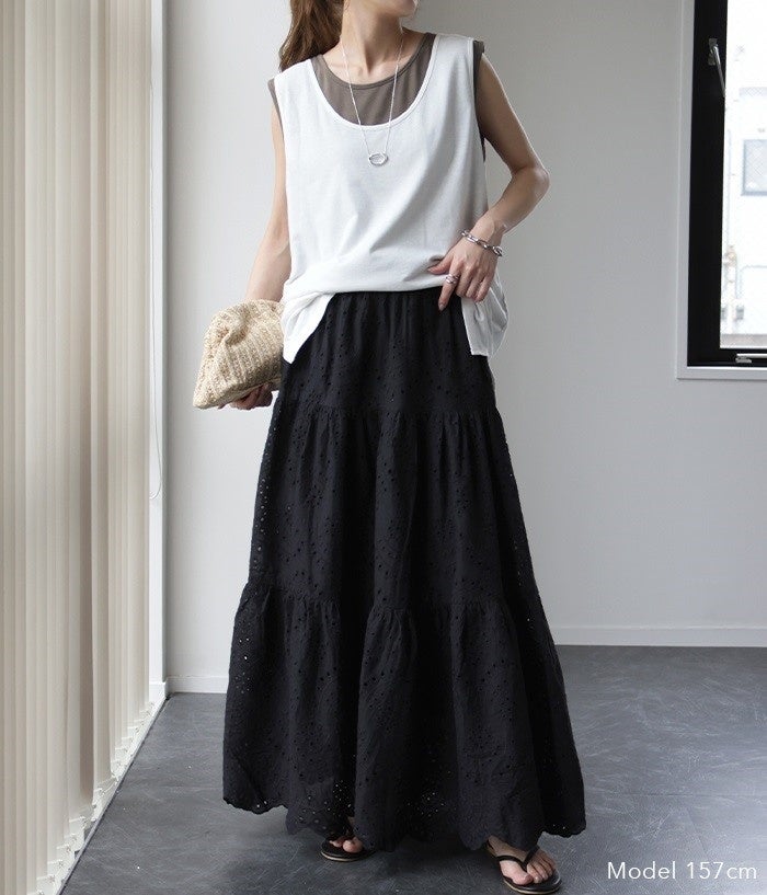 スカラップレースと程よいボリューム感が大人かわいく、コットンの裏地で快適な着心地。配色タンクトップとビーサンで夏気分を先取り。