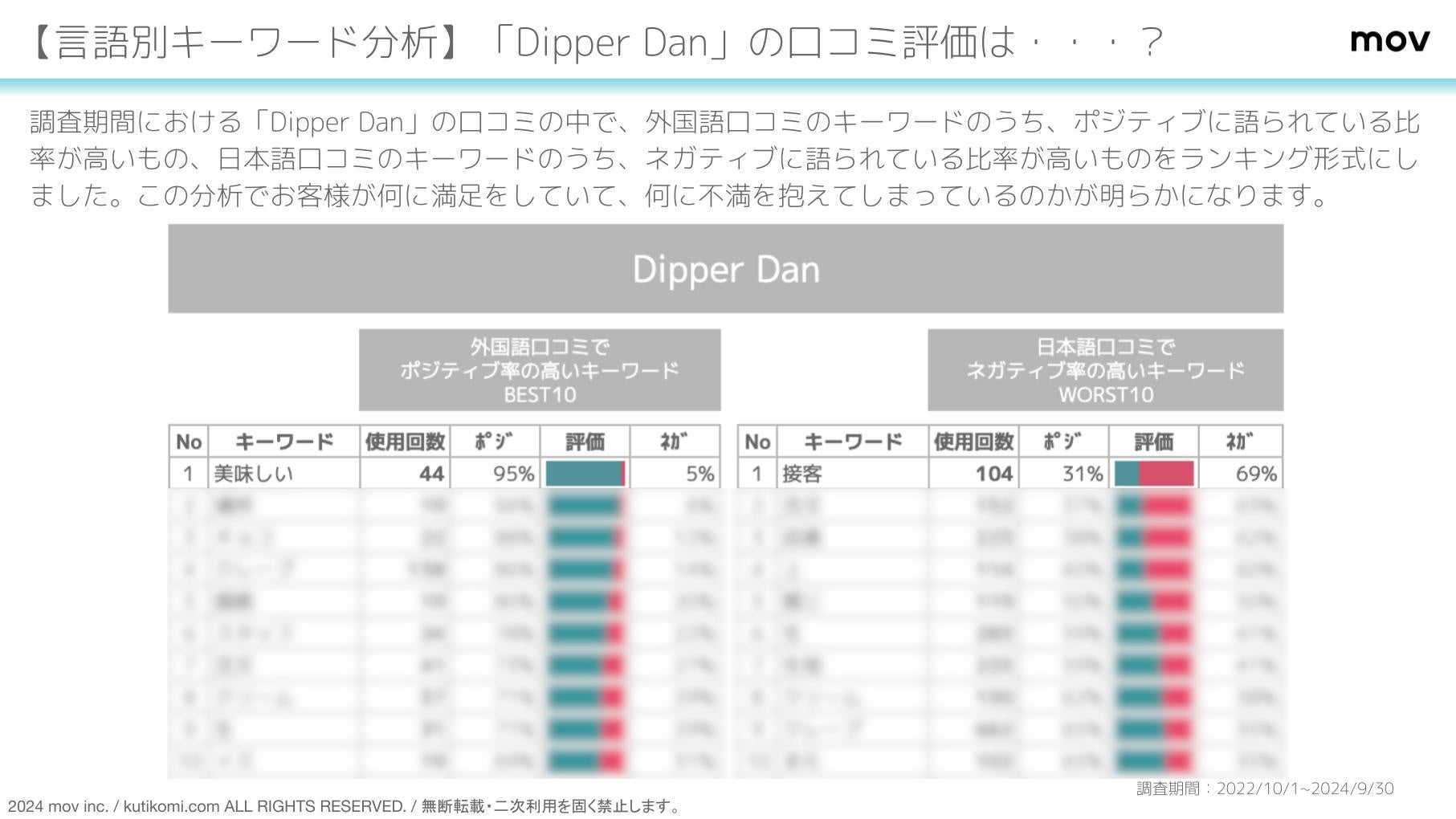 調査期間における「Dipper Dan」の口コミの中で、外国語口コミのキーワードのうち、ポジティブに語られている比率が高いもの、日本語口コミのキーワードのうち、ネガティブに語られている比率が高いものをランキング形式にしました。