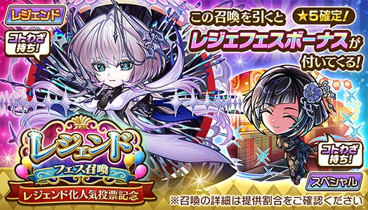 「ヨサリ」がすごわざで新効果の「重圧」を敵に付与できるレジェンドコトダマンとなって「レジェンドフェス召喚」に登場します。「レジェンドフェス召喚」では、特別なおまけとして、10連ごとに1回、開催中の「レジェンドフェス召喚」から出現する★5コトダマン1体を召喚のおまけとして獲得できる「レジェフェスボーナス」が発生します。
