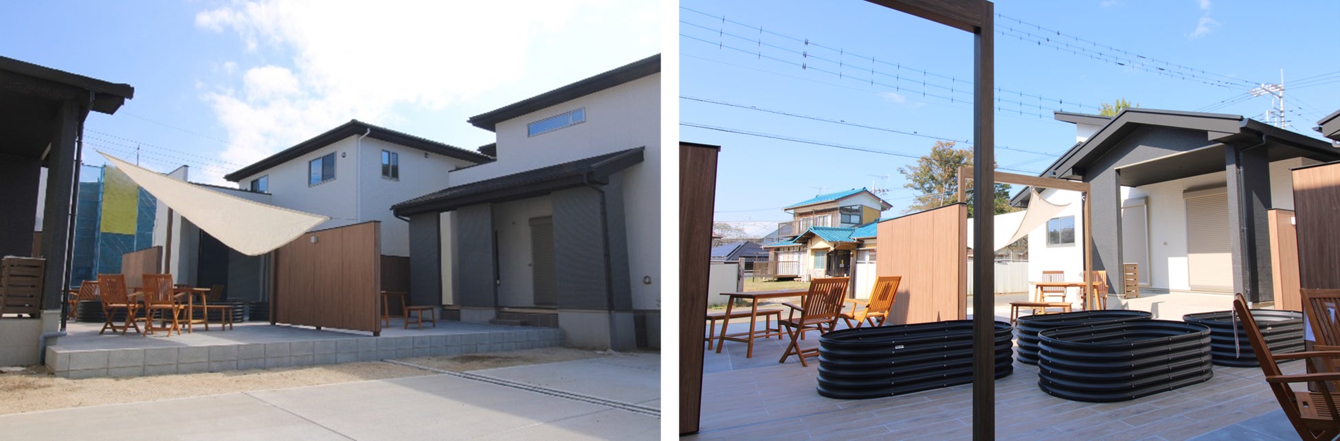 屋内・半屋外・屋外という三つの異なる空間をキッチンの近接エリアに配置することで、気軽に食事場所を選ぶことができるように計画しています。屋外空間は、分譲地内の四棟の庭が互いに向かい合う配置を意識し、空間の広がりと開放感を演出するとともに、アートボードを設置することでプライバシーを確保しつつも隣人の気配を感じられる程よい距離感をつくりだしました。