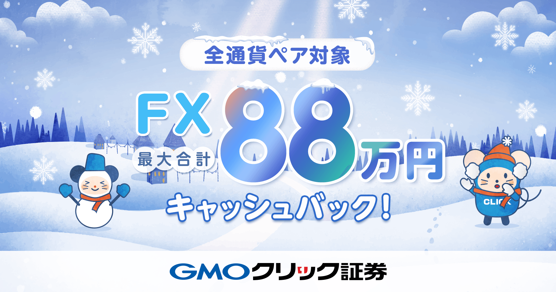 GMOインターネットグループのGMOフィナンシャルホールディングス株式会社の連結会社で、金融商品取引業を営むGMOクリック証券株式会社(本社:東京都渋谷区、代表取締役社長:高島 秀行、以下:当社)は、2024年1月9日(火)より、お客様の日頃のご愛顧に感謝の気持ちを込めて「【全通貨ペア対象】最大合計88万円キャッシュバックキャンペーン」を開始いたします。