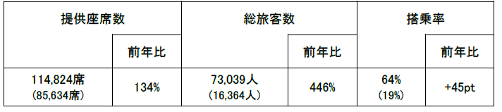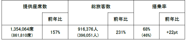 国内線の総旅客数は、前年比で231%となっており、大変好調に推移しました。方面別では、全方面で前年を大きく上回っていますが、特に、東北・北陸、関西、中国・四国方面の総旅客数は前年比で約3倍となり、好調に推移しました。日別では、下りが4月29日をピークに5月3日まで、上りは5日をピークに、搭乗率の高い日が続きました。