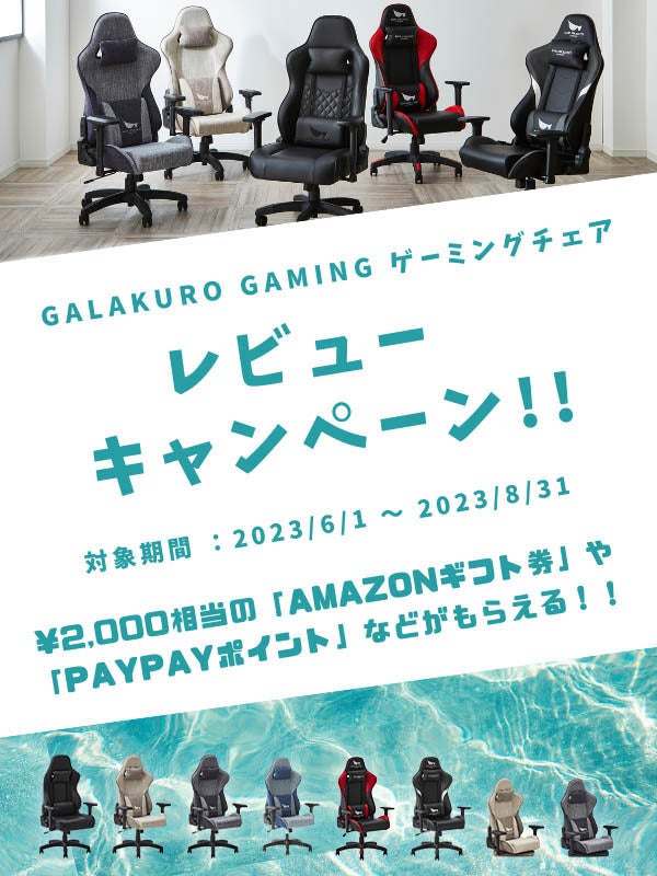 ゲーミングブランド「GALAKURO GAMING」は、期間中にゲーミングチェア「GG-C」「GG-LC」シリーズをご購入いただき、レビューを投稿していただいた先着250名様に¥2,000相当のAmazonギフト券やPayPayポイントなどをプレゼントするキャンペーンを開催いたします。