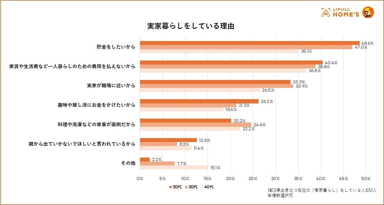 また、実家で暮らしている理由を聞いたところ、「貯金をしたいから」が20代では48.6%、30代で47.0%、40代では「家賃や生活費など一人暮らしのための費用を払えないから」が36.8%で最多となり、各年代共に金銭的な理由が上位となりました。