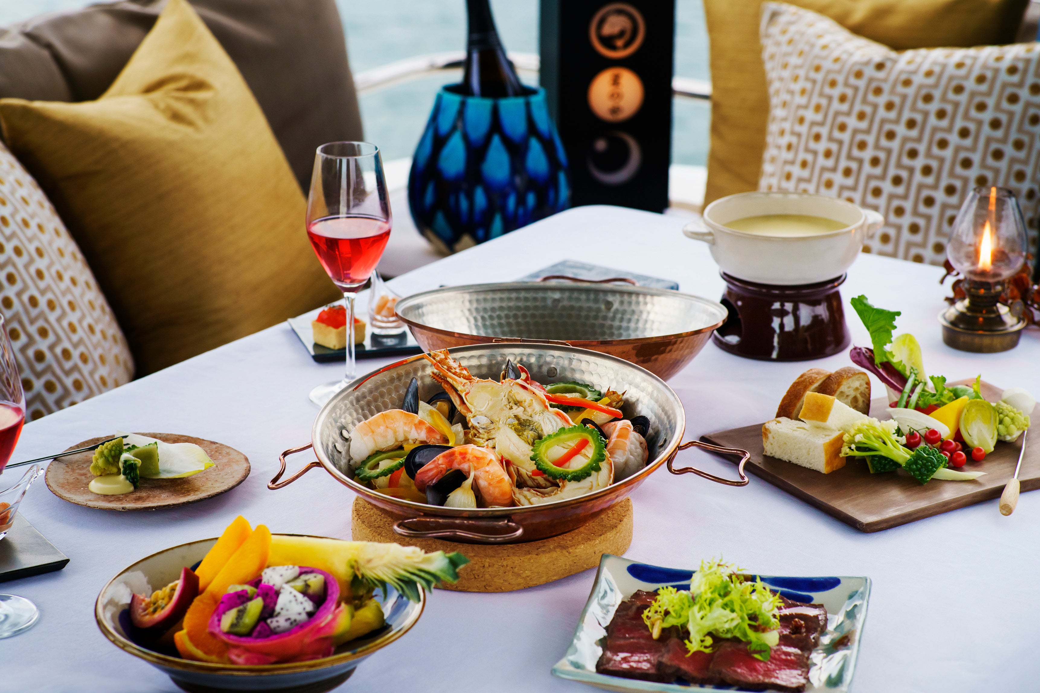 夕暮れの時間には空を眺めながら船上ディナーを楽しみます。魚介をふんだんに使用した彩り豊かなブイヤベースやチーズフォンデュなど、星のや沖縄のシェフが下ごしらえした料理を堪能します。貸し切りのクルーザーの上で出来立ての料理を味わいながら過ごす時間は格別です。昼と夜が混ざり合い、だんだんと変化していく空や海を眺める優雅な時間を過ごします。
