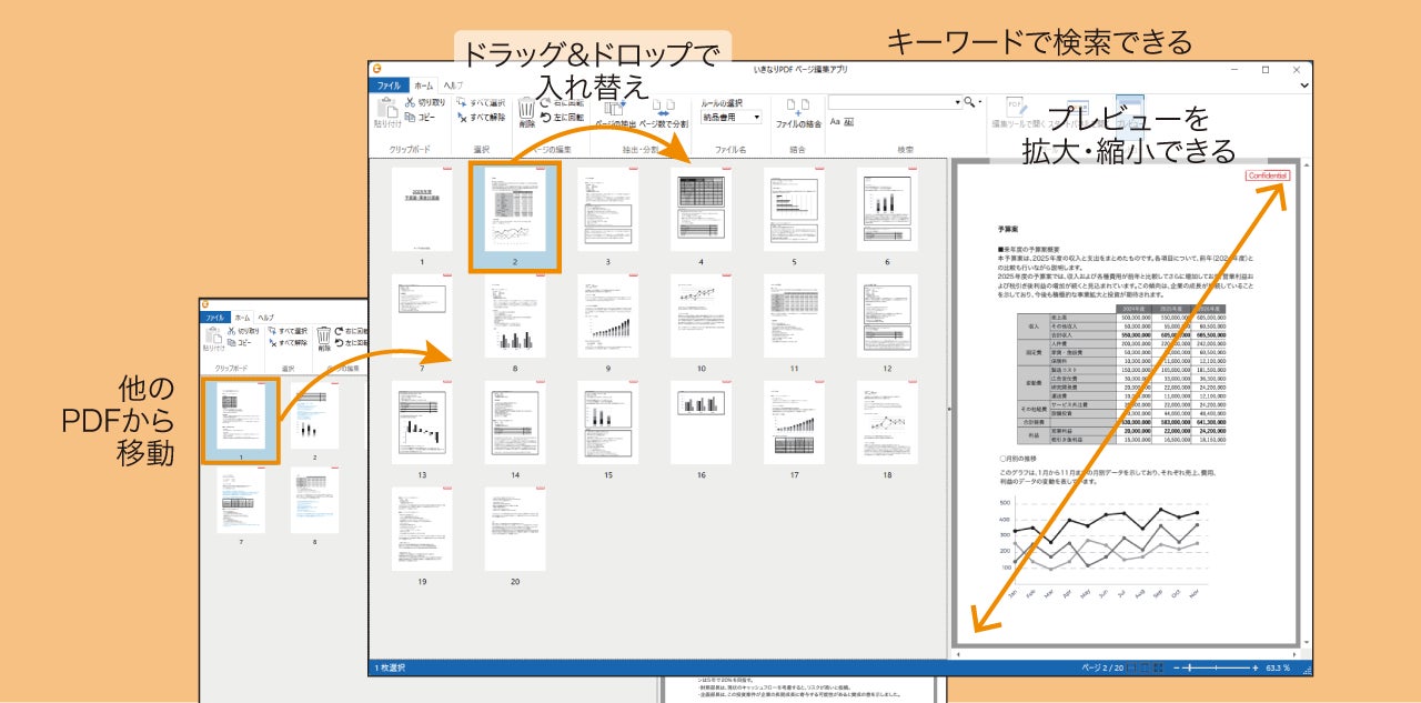 ページ単位での結合、削除、並び替えなどの操作がより直感的に操作しやすくなり、PDFのページ単位の編集の作業が効率化します。