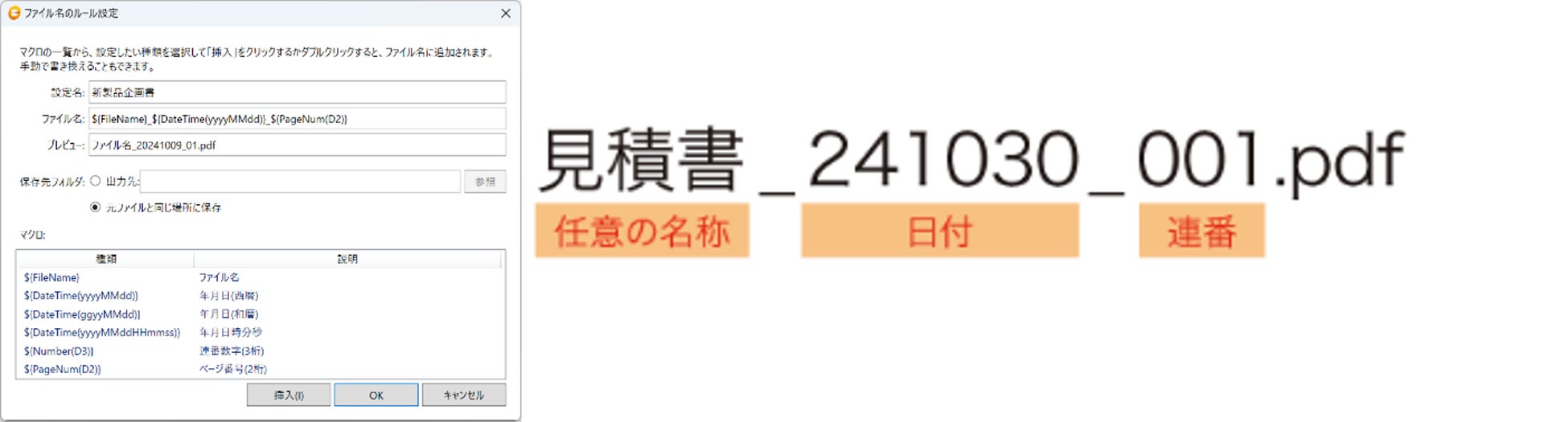 PDFを抽出した際のファイル名のつけ方をあらかじめ設定できます。元ファイルの名称や日付、連番、ページ番号を柔軟な組み合わせが可能です。