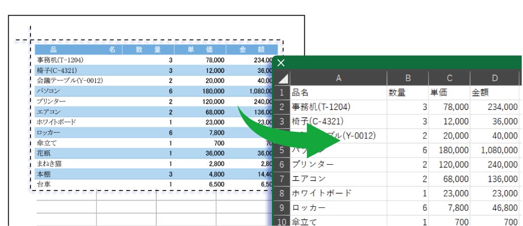 通常はコピペできない画像やPDFの表組みも、囲んでワンクリックで数字や文字を読み取り、Excel上に再現できます。
