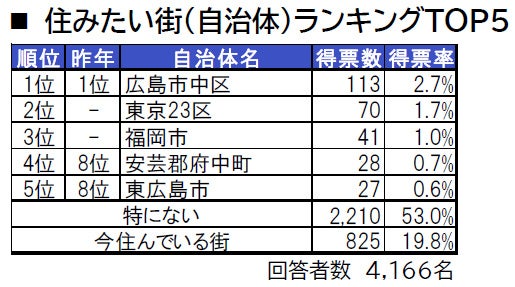 今年は全国の自治体を対象に変更しましたが(昨年は中国エリアの自治体のみを対象として集計)、1位は変わらず広島市中区です。なお、同自治体は、広島都市圏在住のみを対象とした「住みたい街(自治体)ランキング<広島都市圏版>」2019年版と2020年版でも1位となっているため、通算で4年連続の1位です。2位は東京23区、3位は福岡市が新たにランクインしています。