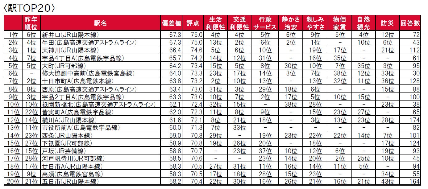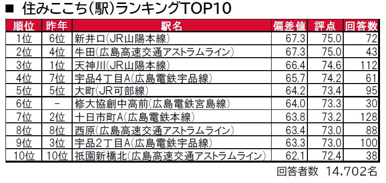 1位は、広島市西区にある新井口です。広島駅へ約12分でアクセスでき、駅前には屋根付きの動く歩道で直結している大型ショッピングセンターがある駅で、昨年6位から順位を上げています。2位は広島市東区にある牛田(昨年4位)、3位は昨年1位だった広島市南区にある天神川です。トップ10内では、昨年は回答者が 30名未満だったため集計対象外だった修大協創中高前が6位にランクインしています。