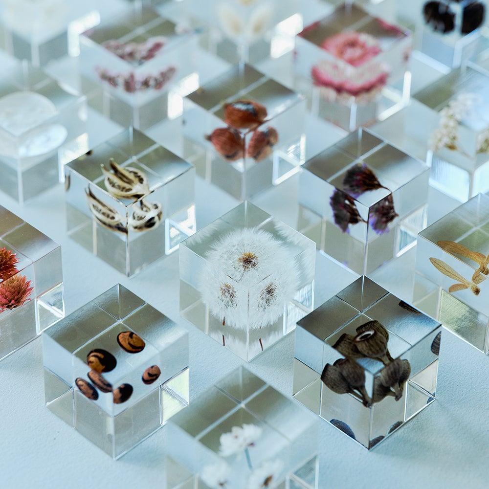 植物が封入されたその透明なアクリルキューブは、普段の暮らしでは見過ごしてしまうような、