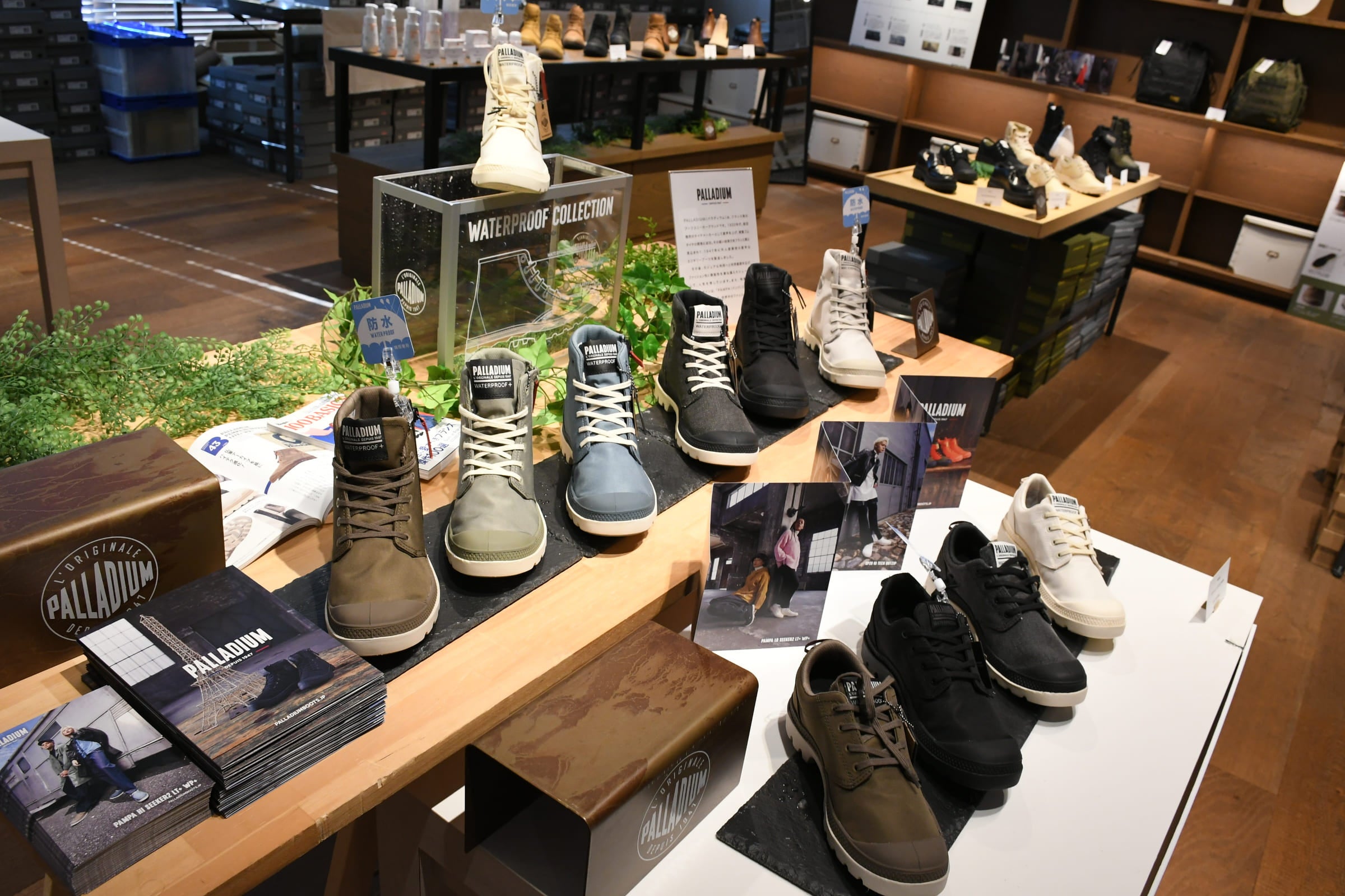 店舗には、シーカー2のLOカットモデルをはじめとした、普段履きしやすい防水シューズの他、ミリタリーテイストあふれるハイカットモデルなど、人気のアイテムが並びます。
