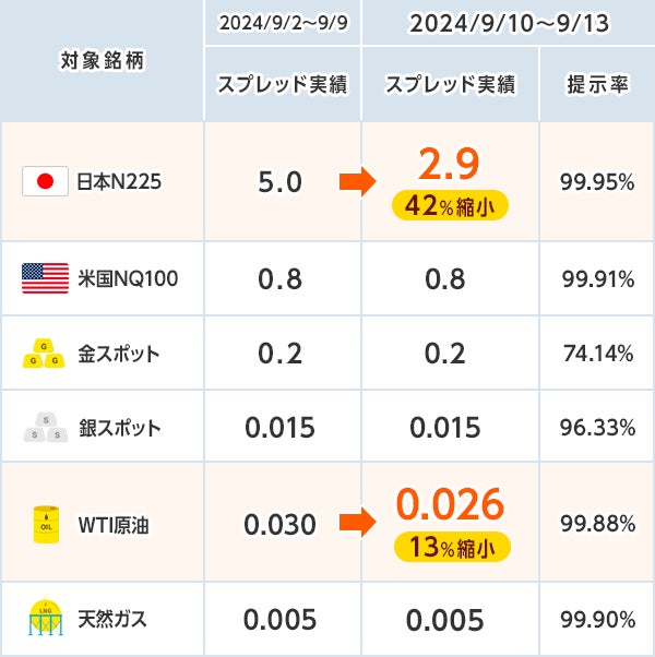 CFDネクストにおいてスプレッド実績は日本N225では42%縮小し2.9(提示率は最も高く99.95%)、WTI原油では 13%縮小し0.026(提示率は99.88%)となりました。