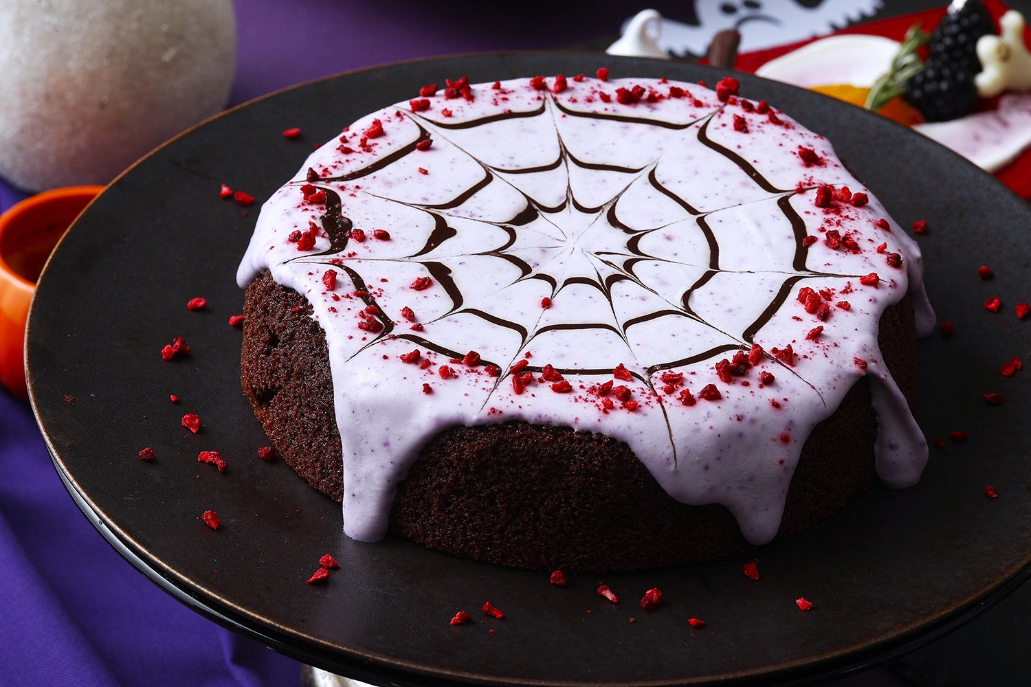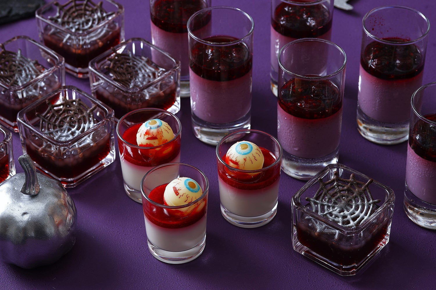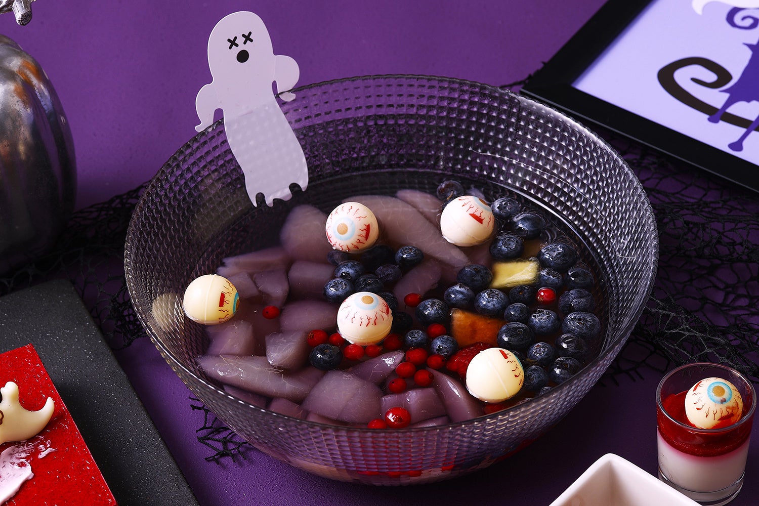 ベリーヌには血のように真っ赤なラズベリージュレをかけたパンナコッタや、ブルーベリーとカシスでさっぱりと仕上げたムース、骨をイメージした白いタピオカをのせたぶどうゼリーをラインナップ。不気味な雰囲気漂うガラスボールは、洋ナシのコンポートとフレッシュベリーをラベンダーシロップの中に入れ、目玉のチョコレートを浮かべて魔女のスープに仕上げました。