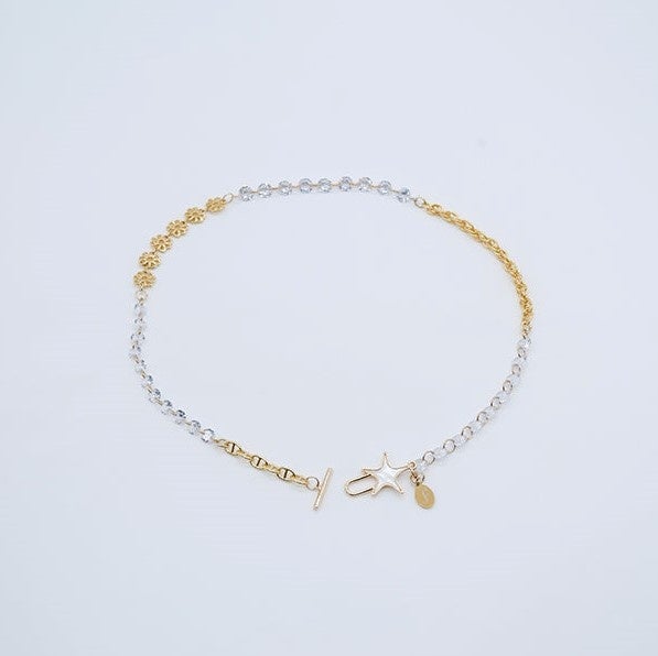 遊び心溢れる繊細な雰囲気を持つネックレス。ゴールドの色合いとキラキラしたフェイクストーンが調和し高級感が漂い、様々なシーンで活躍するアイテムとなっています。