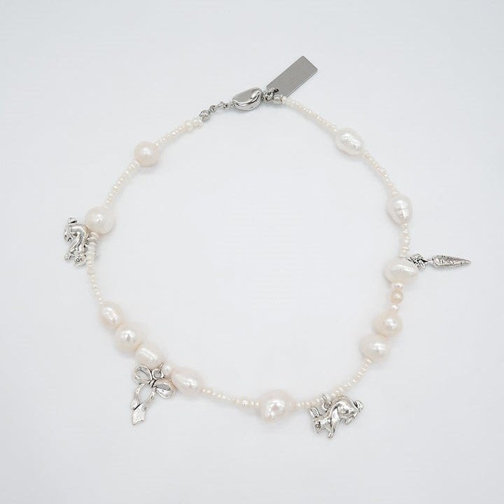 淡水パールを贅沢に使用した、上品なネックレス。チャームには動物やリボンが使用されており、繊細さと遊び心がミックスしたネックレスです。パールだけでは物足りない方に向けて、ファッションのポイントとなるアイテムです。