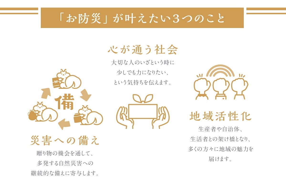 ○「お防災」は、災害時の備蓄としても活用可能な、日持ちのする地域商品を詰め合わせたギフトセットです。家庭内での非常食備蓄の重要性が高まるなか、防災の日(毎年9月1日)やパーソナルギフトの機会に、家族や知人に贈ることを想定しています。