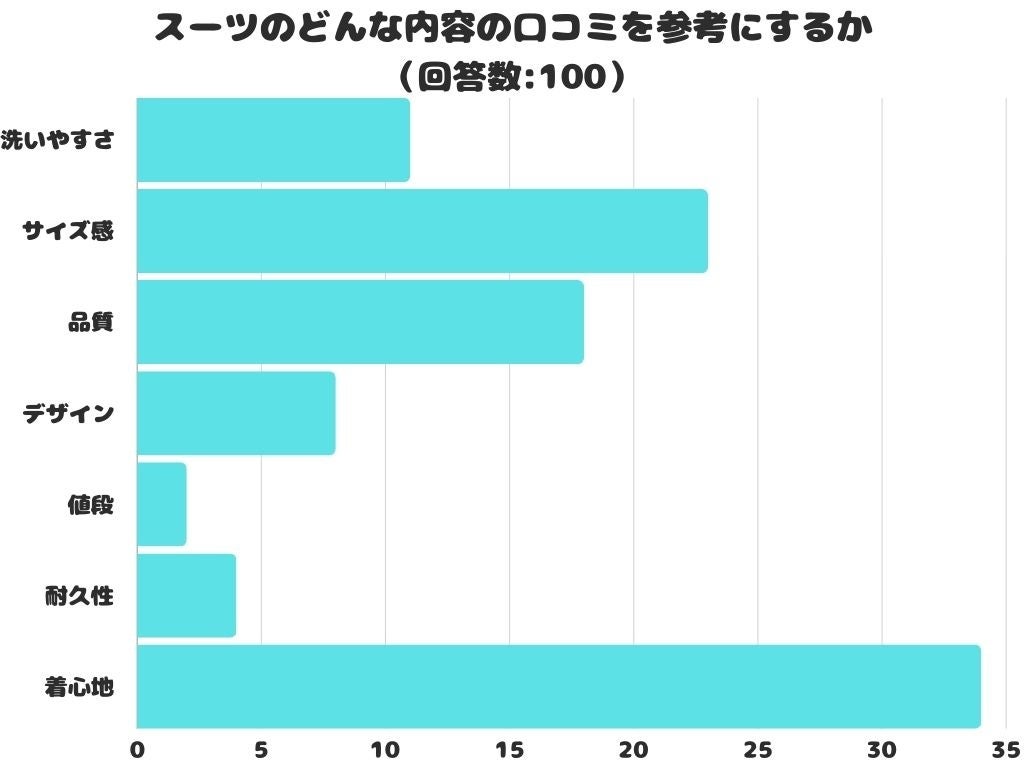 スーツのどんな内容の口コミを参考にするかをアンケートにて調査したところ、1位は「着心地」でした。