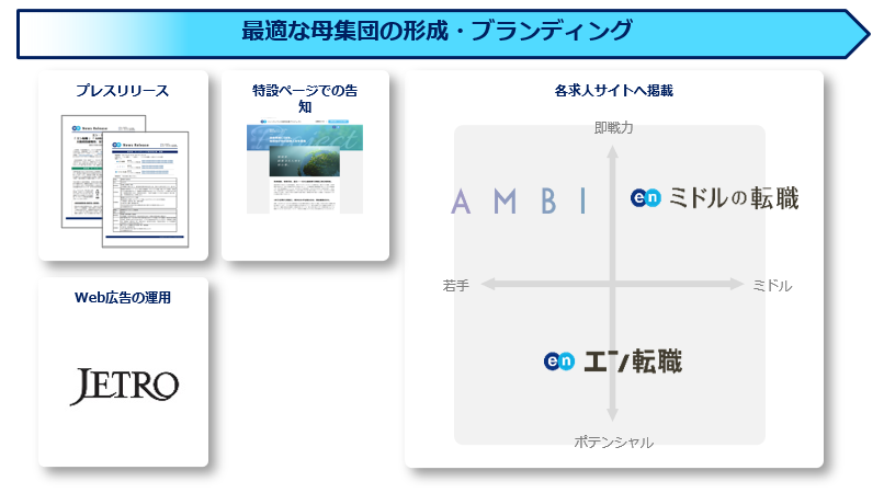 プレスリリースや特設ページ、Web広告での告知に加え、各求人サイトでの集客サポートを実施いたします。『エン転職』『AMBI』『ミドルの転職』とターゲットの異なる3つの求人サイトを活用することで、ターゲットへ網羅的に求人を届けます。
