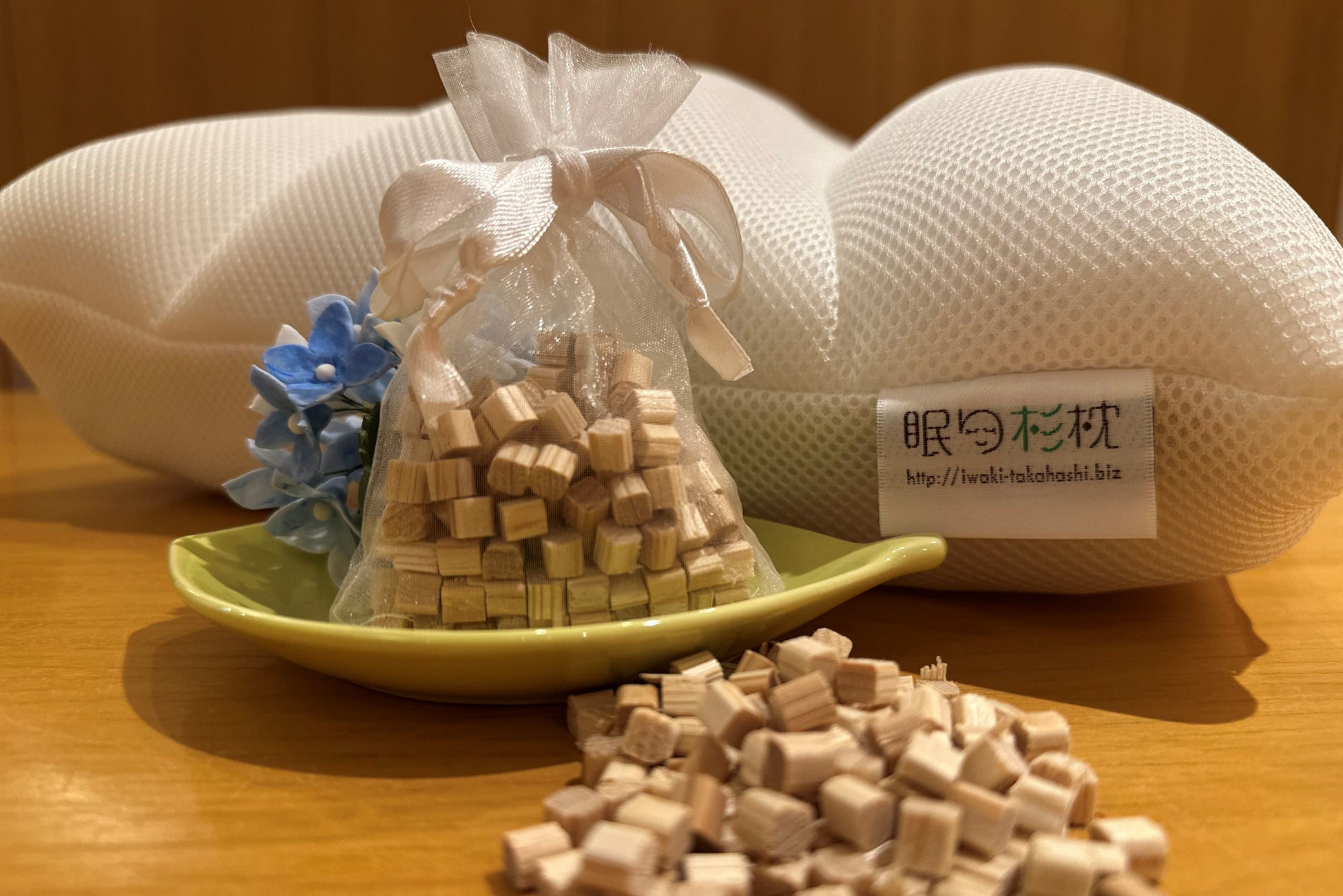 地元いわき市の「磐城杉」の間伐材を使用した「杉チップ」を使用。自律神経に作用し、心身をリラックスさせる効果がある「セドロール」がふんだんに含まれており、まるで森林浴をしているような、心地よい誘眠をサポート。2019年現在、枕として間伐材マーク※(全国森林組合連合会)、木づかいサイクルマーク(日本木材総合情報センター)の製品認証を取得した、日本で唯一の製品。この枕に使用している「杉チップ」の香り袋を宿泊者特典としてプレゼント。
