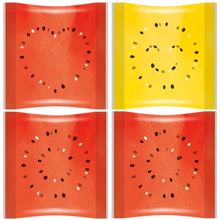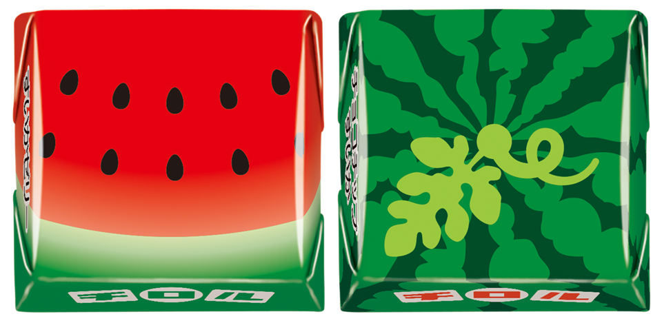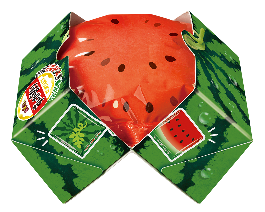 2022年・2023年に発売した人気商品をプチリニューアル!BOXのミシン目に沿って手でパカッと割ると、中からはすいかの果肉をイメージした袋が出現!果肉を模した中袋には、ハートマークやニコニコマーク(全4種)がデザインされており、何が出るかはお楽しみです。