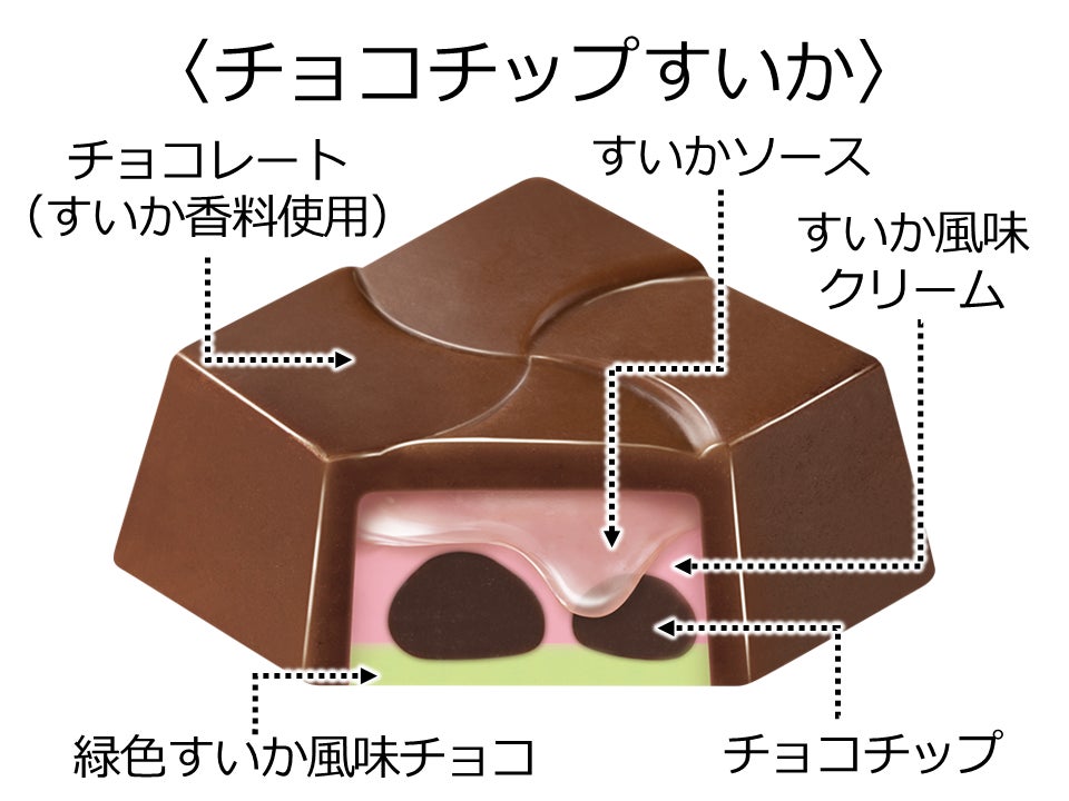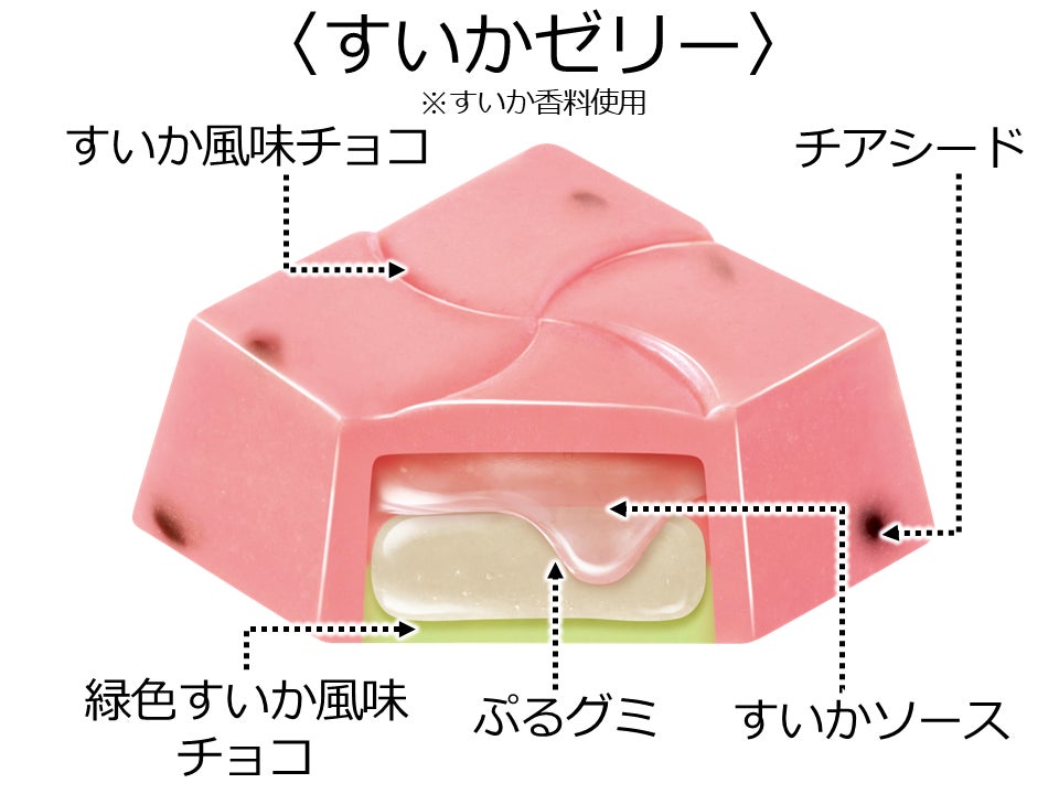 すいかソースとぷるグミでジューシーなすいかゼリーを再現しました。すいか風味のチョコには、すいかの種をイメージしたチアシードを入れており、食感のアクセントになっています。