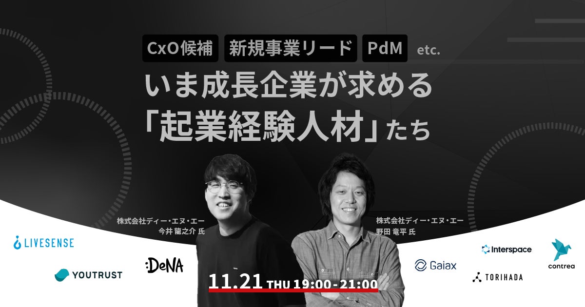 株式会社ガイアックス(本社:東京都千代田区、代表執行役社長:上田 祐司、証券コード:3775、以下 ガイアックス)は、東京都「リスタート・アントレプレナー支援事業」において、起業家たちの再出発を支援する「TOKYO Re:STARTER(以下、本事業)」におけるコミュニティ運営の一環として、起業経験者/起業関心層向けイベント『いま成長企業が求める「起業経験人材」たち。』を11月21日(木)に開催します。