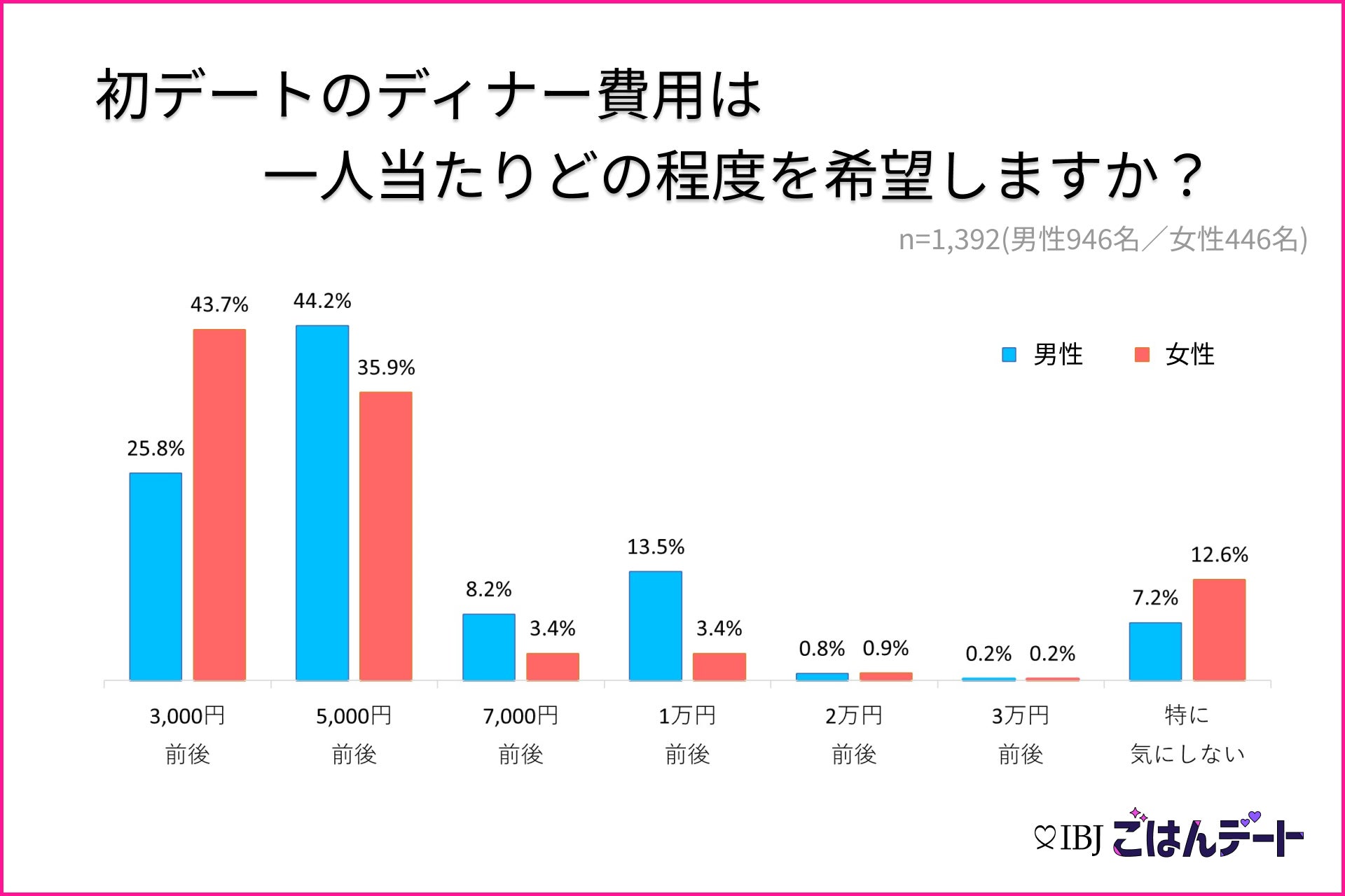 【婚活男女1,392名に調査】初デートのディナー代、一人当たりの費用は男女で2,000円の認識差あり。